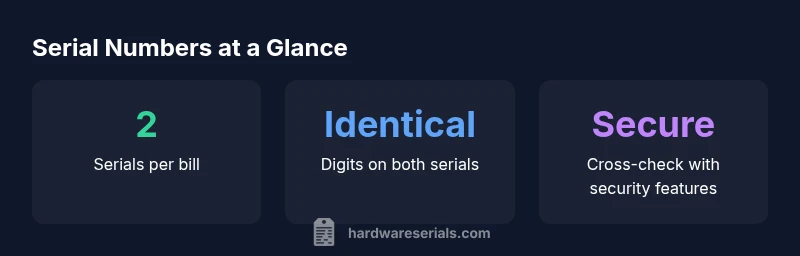 For a dollar bill look up serial number, start by locating the two serial numbers on the front of the note. They are printed in the same font and pattern near the upper left and lower right corners. Serial numbers help identify the bill's issuing district and track issuance, but they should be used with security features for authentication. According to Hardware Serials, serial numbers are a starting point for verification, not definitive proof of legitimacy.