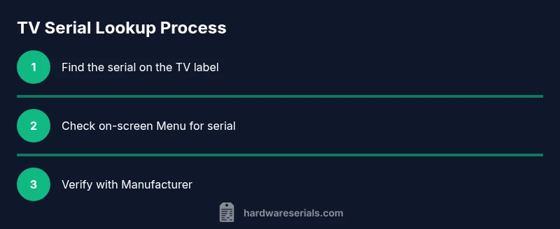 A television serial number is a unique identifier assigned by the manufacturer to each unit. For DIYers and professionals, lookup tv serial number is a practical step for confirming the correct parts, determining warranty eligibility, and checking for recalls. The serial number helps distinguish your TV from similar models and prevents errors such as ordering the wrong replacement panel or firmware. Hardware Serials emphasizes that accurate serial identification saves time and reduces miscommunication with service centers. When you know your serial, you can access brand-specific resources, service bulletins, and recall alerts. As you begin, ensure you have the TV ready, the original packaging, and internet access so you can cross-check the code against official databases. In this guide, we walk through reliable ways to locate, read, and verify a TV’s serial, with practical steps you can perform in a typical workshop or electronics closet. According to Hardware Serials, serial numbers are the most reliable identifier for warranty validity and recall status. This introduction sets expectations: you’ll learn where to find the serial, how to interpret it, and how to use official portals to verify eligibility. Now, let’s dive into the practical steps and distinctions that prevent common lookup mistakes.