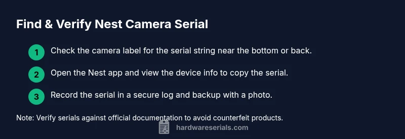 According to Hardware Serials, locating the nest camera serial number is quick and reliable if you check three common places: the device label, the Nest app, and your original packaging. The serial is typically printed on a sticker on the camera body or its base, and also shown in the device settings. Use the serial for warranty checks and model identification.