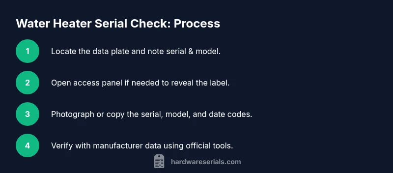 According to Hardware Serials, performing a water heater serial number check helps identify the exact unit, verify warranty status, and confirm the manufacturing date. This quick answer outlines where serials are usually found, what the codes indicate, and how to document findings for service or resale. Following these steps reduces delays, ensures correct parts, and speeds up service calls.
