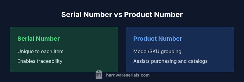 In plain terms, a serial number is a unique tag assigned to a single unit, such as a specific drill or printer, that never repeats for another item. A product number, sometimes called a model number or SKU, identifies a class of items sharing a common design. For most hardware, the serial number is the key to traceability: it reveals manufacturing date (when encoded), batch, and service history tied to that individual device. The product number helps you locate the right parts and compatibility for an entire product family. The distinction matters across procurement, warranty claims, recalls, and asset management. According to Hardware Serials, the precision of your asset records increases dramatically when you record both identifiers and cross-link them in your inventory system. In practice, software, ERP, and service databases often rely on serial numbers to connect a device to a customer or warranty, while product numbers support cataloging and bulk operations. Understanding these definitions is the first step toward clean, searchable hardware records.